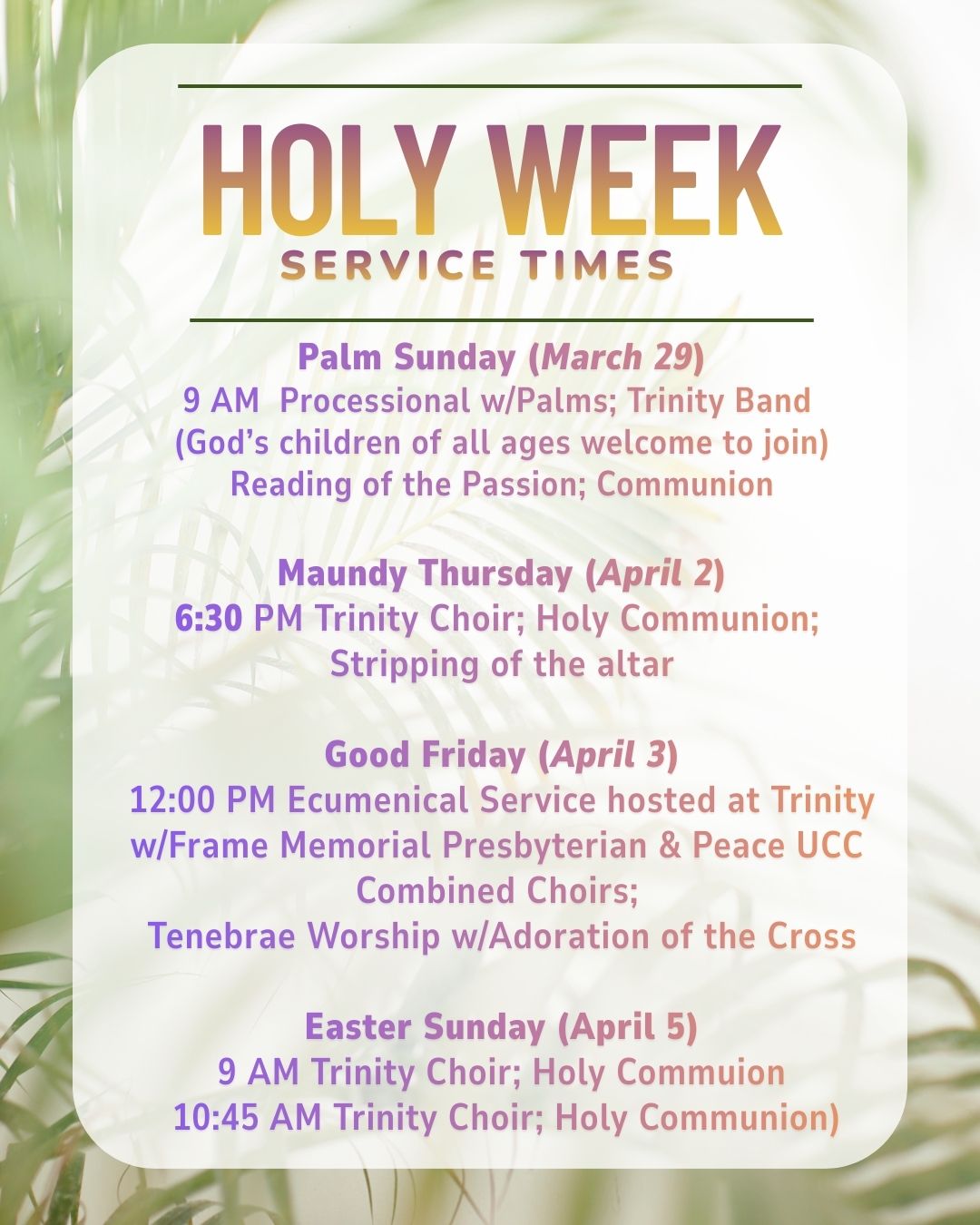 Welcome to the Trinity Lutheran Church website. Our church members are engaged in countless ministries all throughout our community and region. The congregation is open and inviting to all persons. Our youth program is strong and inspired. We are pleased you have chosen to visit our website.