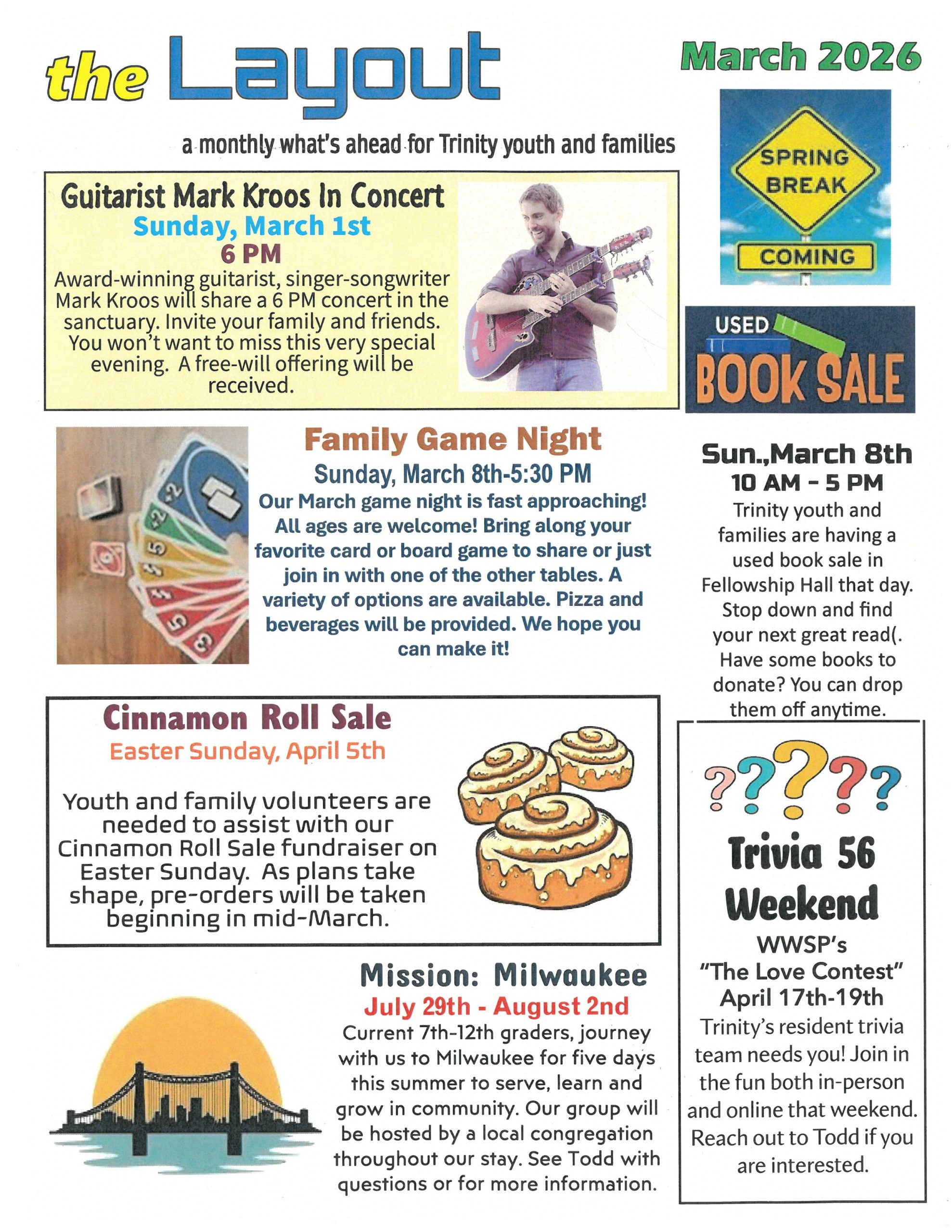 Trinity’s Youth and Family Program not only connects young people with each other, but with generations through the congregation and community. We learn and grow together by having fun, serving, asking lots of questions and being the uniquely gifted people God created us to be. Regular weekly and monthly activities may include bible studies, movies, sports, concerts, community events, youth gatherings, fundraisers and more. Here’s hoping you’ll join us and see the many things God is up to here!