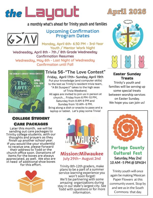 Trinity’s Youth and Family Program not only connects young people with each other, but with generations through the congregation and community. We learn and grow together by having fun, serving, asking lots of questions and being the uniquely gifted people God created us to be. Regular weekly and monthly activities may include bible studies, movies, sports, concerts, community events, youth gatherings, fundraisers and more. Here’s hoping you’ll join us and see the many things God is up to here!